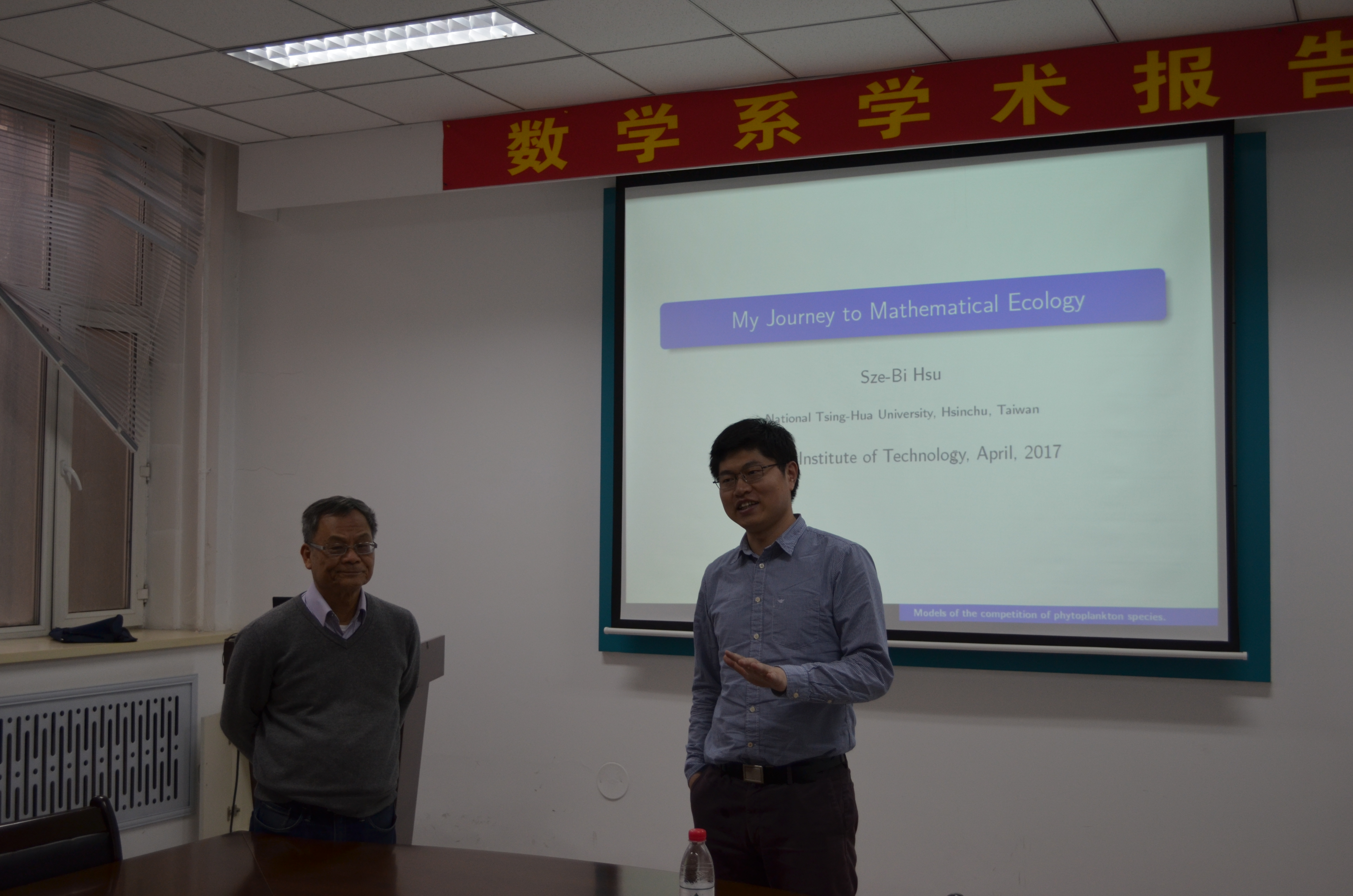 4月5日下午在格物楼503会议室,应数学学科青年教师联合会的邀请,台湾清华大学讲席教授、著名生态数学家许世壁老师做了两场精彩的演讲。首先,分享了他的科学研究经历,从当初为何选择生态数学这个领域,又为什么短暂地中断,到后来四十年的执着之路。接着,带来了一场关于浮游生物最新研究进展的报告。演讲吸引了来自yl8cc永利线路检测中心、哈工程、黑大、哈师大、哈理工等40多位相关专业的师生,期间大家展开了激烈的讨论!
