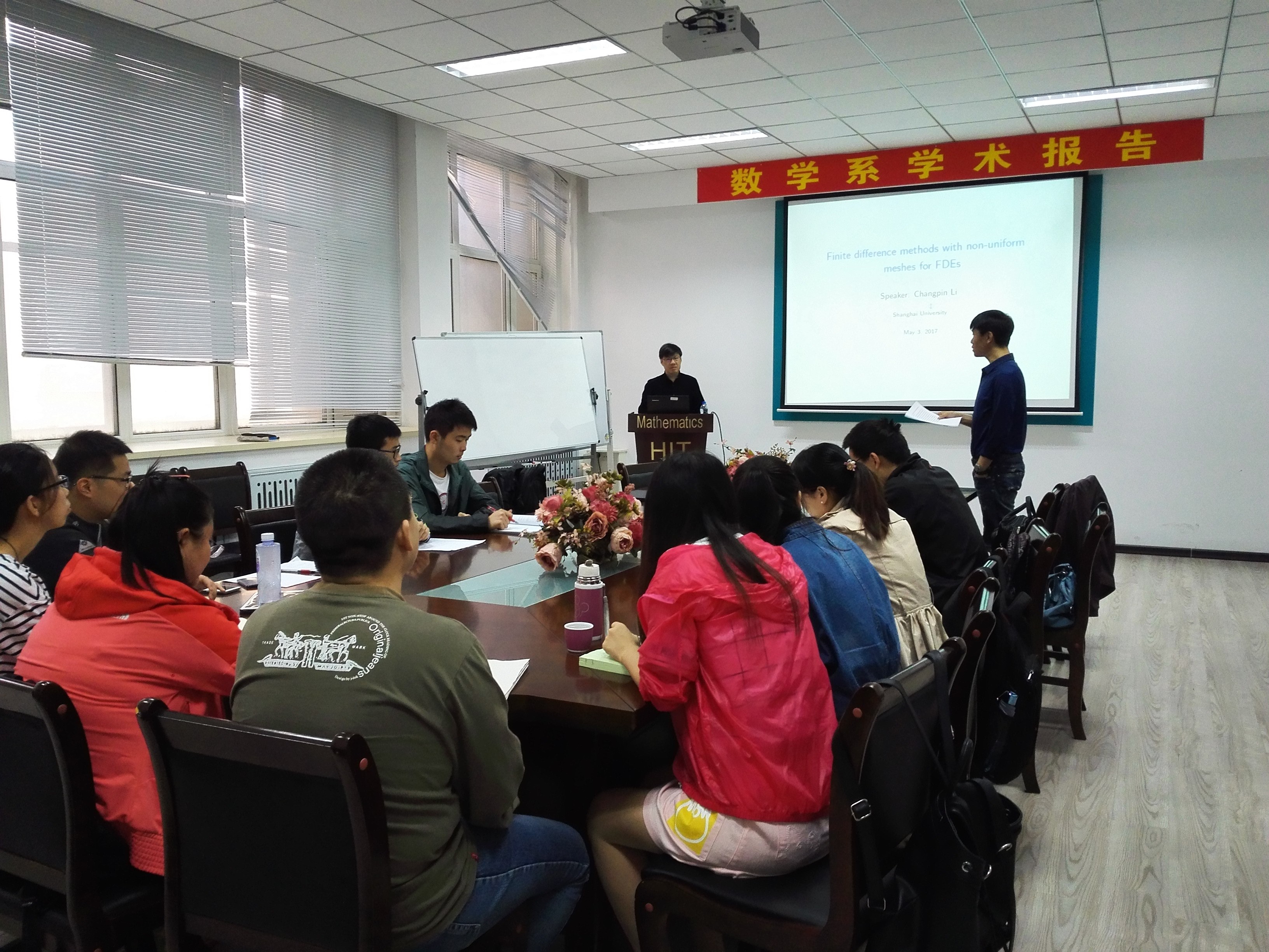 应yl8cc永利线路检测中心数学系赵景军教授的邀请,2017年5月3日 上午9:00-10:00在格物楼503,上海大学李常品教授来访数学系并做学术报告。报告题目:Finite difference methods with non-uniform meshes for FDEs,报告由赵景军教授主持,数学系20余位师生听取了报告,并进行了热烈的讨论。 报告摘要: Generally speaking, the fractional differential equations (FDEs) are quite different from the integer-order differential equations. For the former, even if the resource item and the initial/boundary value conditions are smooth enough, the solutions of the corresponding equations can be non-smooth. On the other hand, for the given fractional differential equations, even if the resource item and the initial/boundary value conditions are non-smooth in the given domain, their solutions can be smooth enough in the same domain. These mean that poor convergent rate may be obtained if uniform meshes are used. In this talk, finite difference methods with non-uniform meshes for solving nonlinear FDEs are presented, where the non-equidistant stepsize is non-decreasing. The rectangle formula and trapezoid formula are proposed based on the non-uniform meshes. Combining the above two methods, we then establish the predictor-corrector scheme. The error and stability analysis are investigated. At last, numerical examples are carried out to verify the theoretical analysis. Besides, the comparisons between non-uniform and uniform meshes are given, where the non-uniform meshes show the better performance when dealing with the less smooth problems. 个人简介: 李常品:上海大学数学系教授、博士生导师。研究兴趣:分数阶偏微分方程数值解、分数阶动力学。在SIAM Journals、J Comput Phys、PRE、Phys D、Chaos等杂志上发表100余篇文章,SCI他引近3000次;在世界科学出版社编辑出版专著1部,在CRC出版社出版专著1部。先后应邀访问南非、新加坡、美国、澳大利亚等国的多所大学。现任Fractional Calculus and Applied Analysis、Int J Comput Math、Int J Bifurcation Chaos、Chaos等SCI杂志的编委或顾问委员会成员。 2010年获上海市自然科学奖,2011年获宝钢优秀教师奖,2012年获最佳黎曼-刘维尔理论文章奖,2016年获“2015年度科学中国人”称号,2016年入选中国高被引学者榜单。