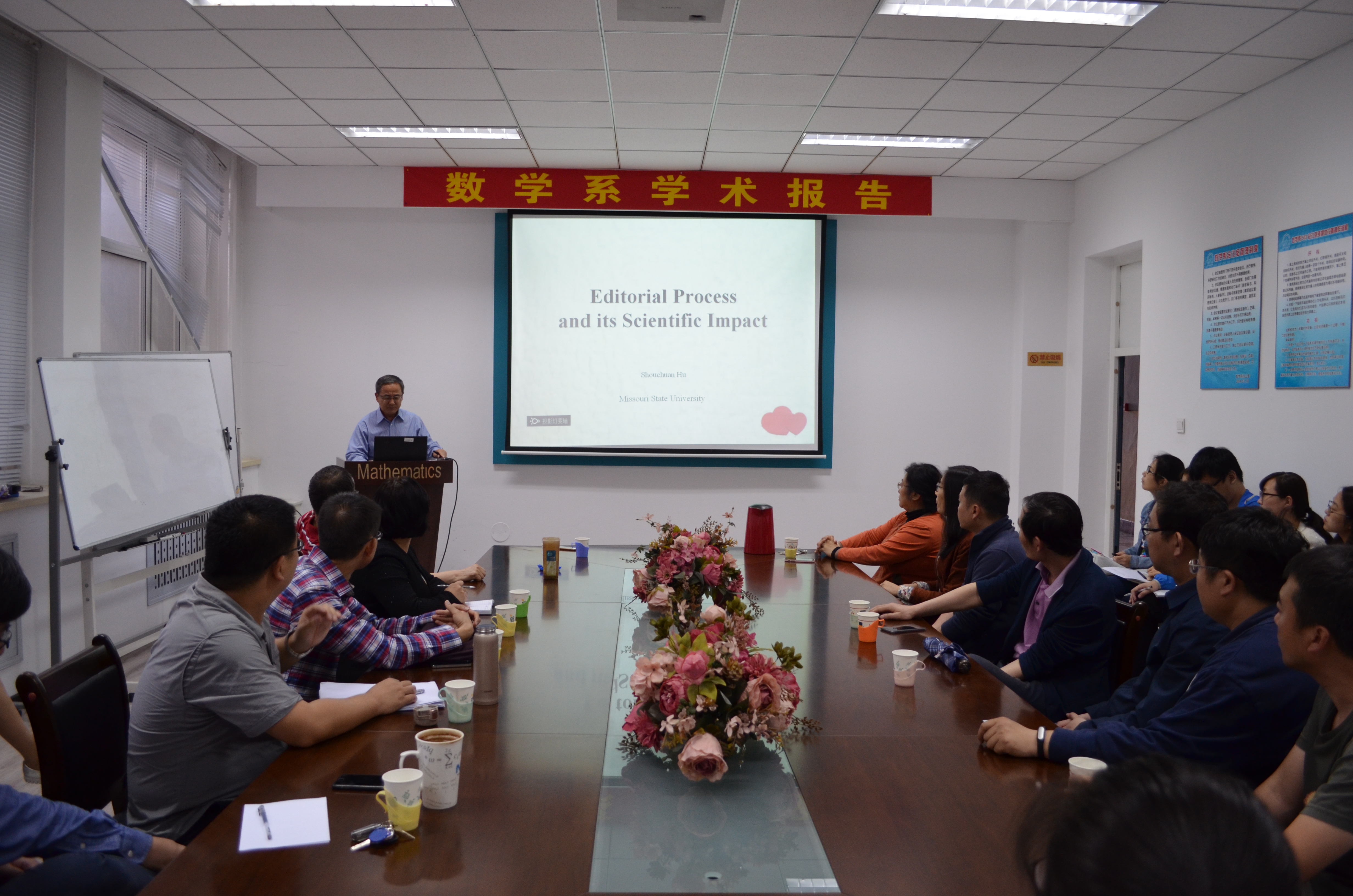 应yl8cc永利线路检测中心数学系吴勃英教授邀请,2017年6月7日 下午14:00-15:30在格物楼503会议室,美国密苏里州立大学胡守川教授来访数学系并做学术报告。报告题目:The Editorial Process and Journal Publication,报告由王明新教授主持,数学系六十余位师生听取了报告,并进行了热烈的讨论。