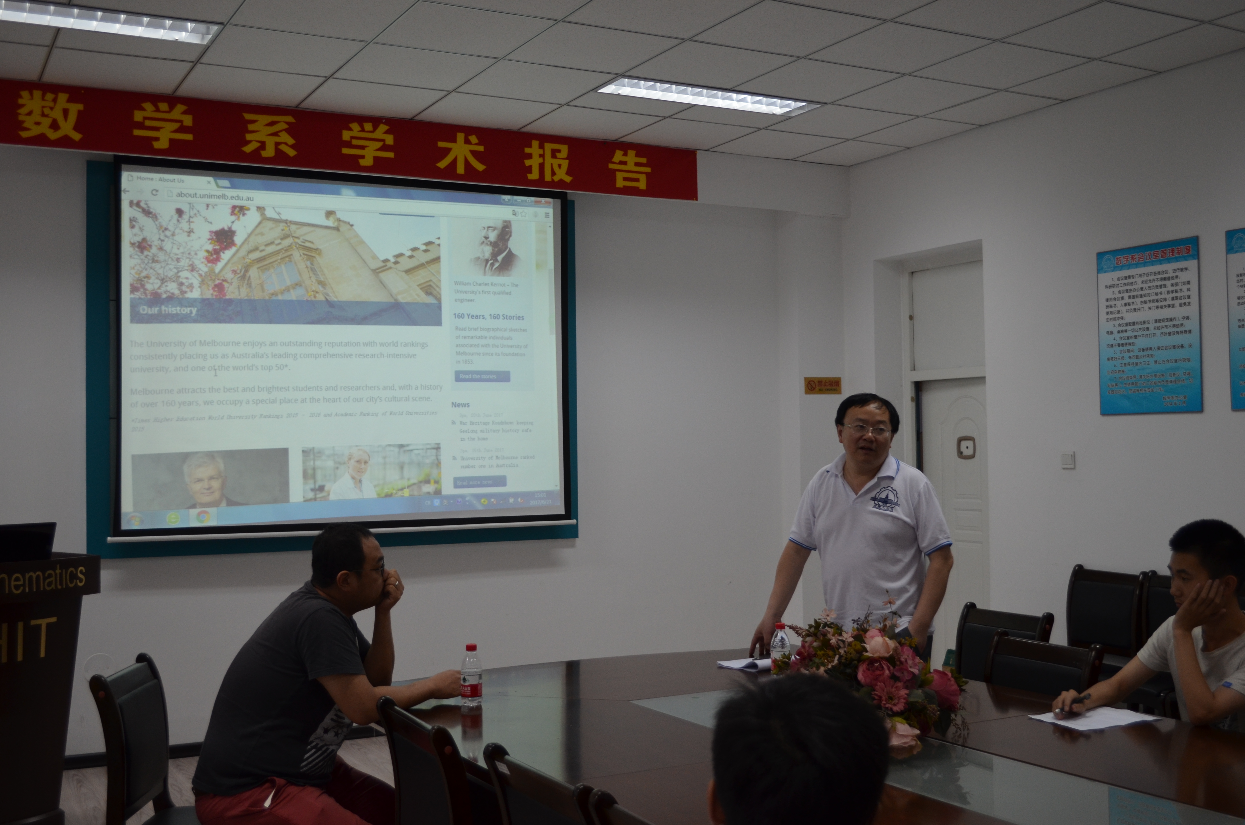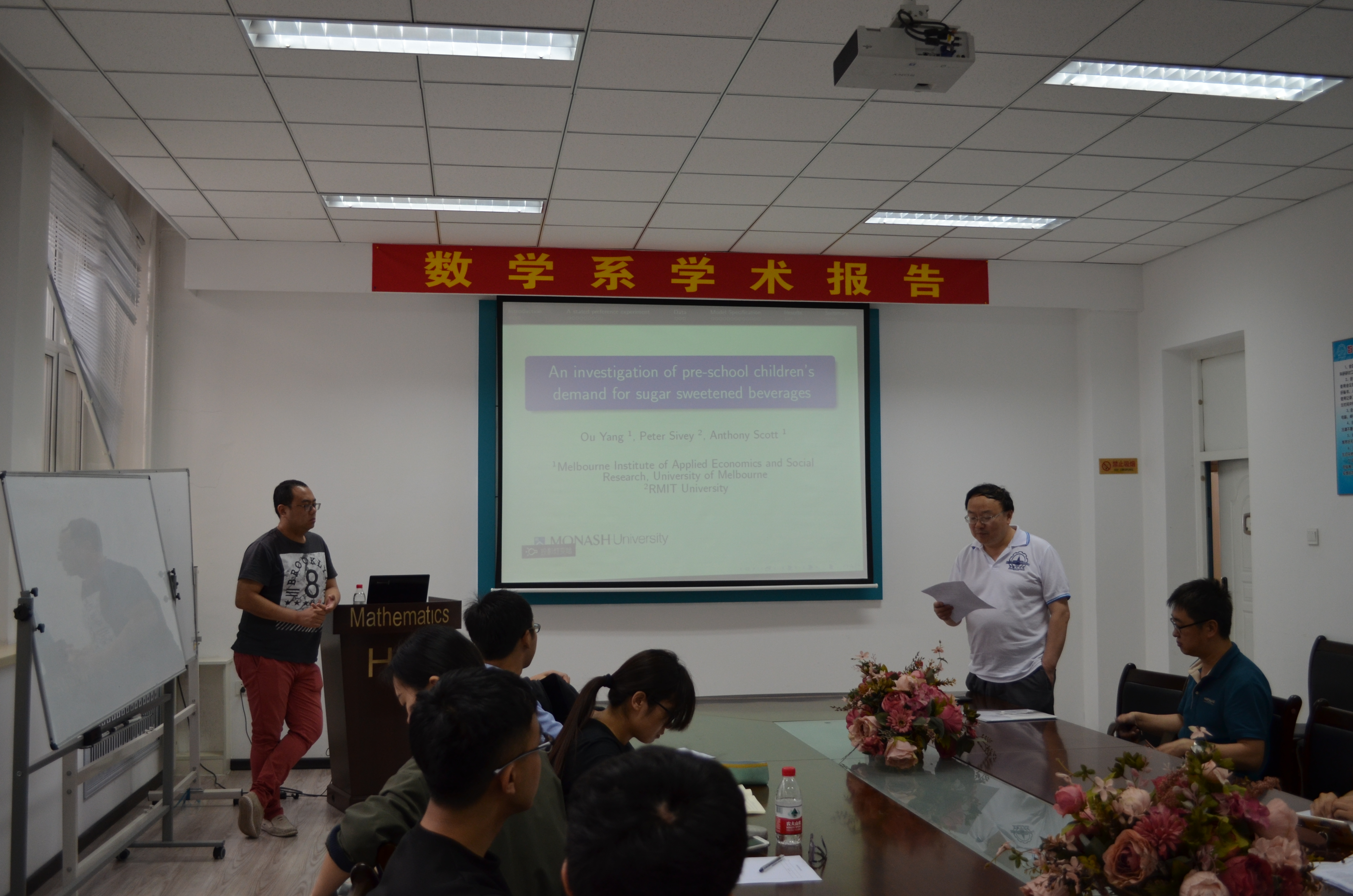应yl8cc永利线路检测中心数学系田波平教授邀请,墨尔本大学杨欧研究员于2017年6月15日至23日在yl8cc永利线路检测中心数学系进行了学术访问,并于6月20日(周二)及21日(周三)两天上午10:00-11:30、下午15:00-16:30在格物楼503会议室作了四个学术报告,报告题目分别为:1. Environmental policy stringency and industrial productivity growth: An varying coecient cost function approach;2. Alcohol Tax Reform, Binge Drinking and Antisocial/Unlawful Behaviours;3.An investigation of pre-school children’s demand for sugar sweetened beverages;4.浅谈墨尔本大学本科生与研究生教育。报告由田波平教授主持,数学系及来访数学系交流的泰国师生听取了报告,并进行了热烈的讨论。