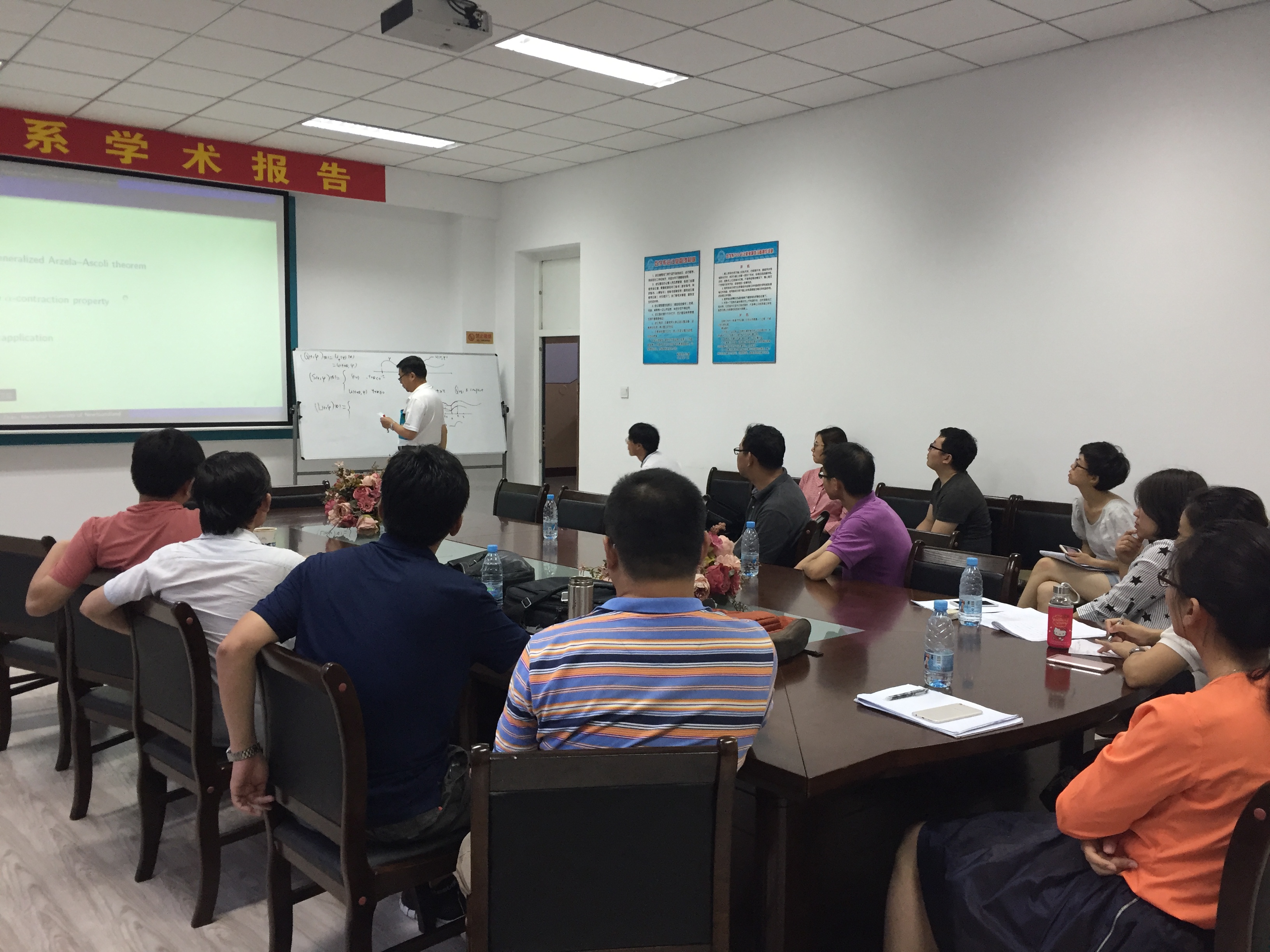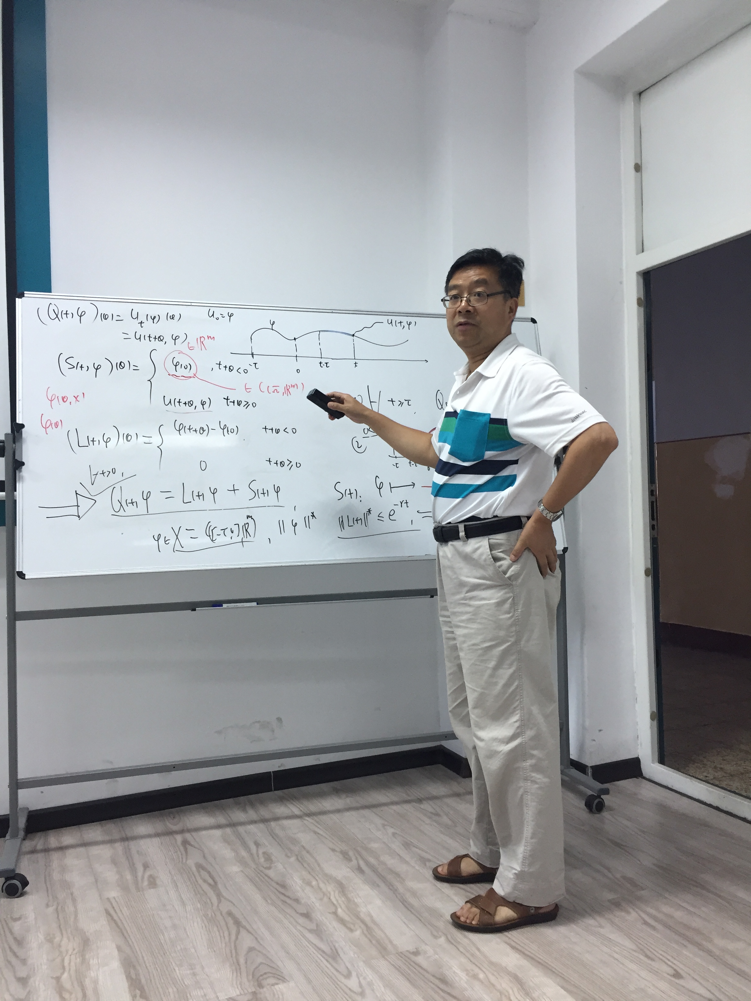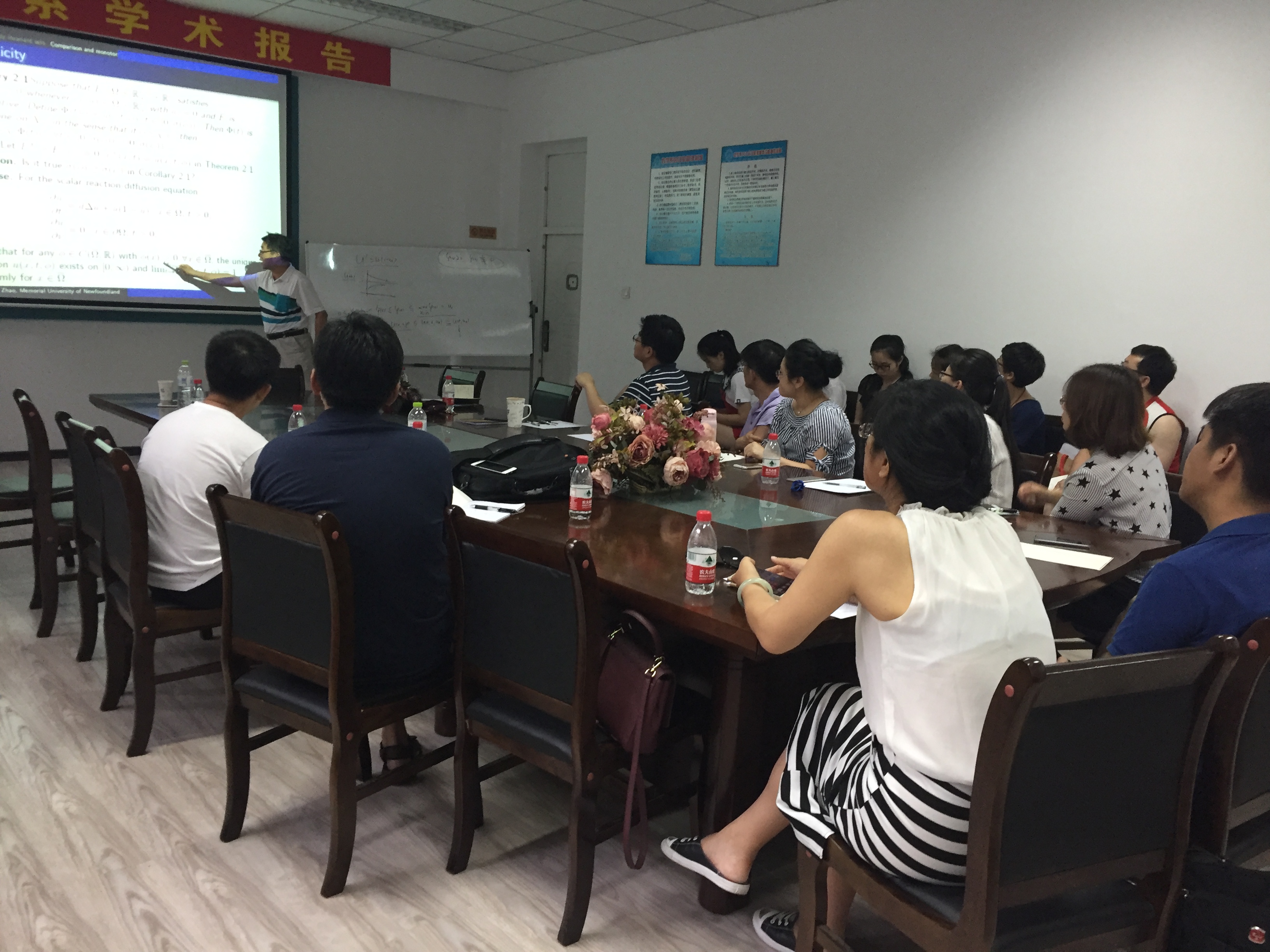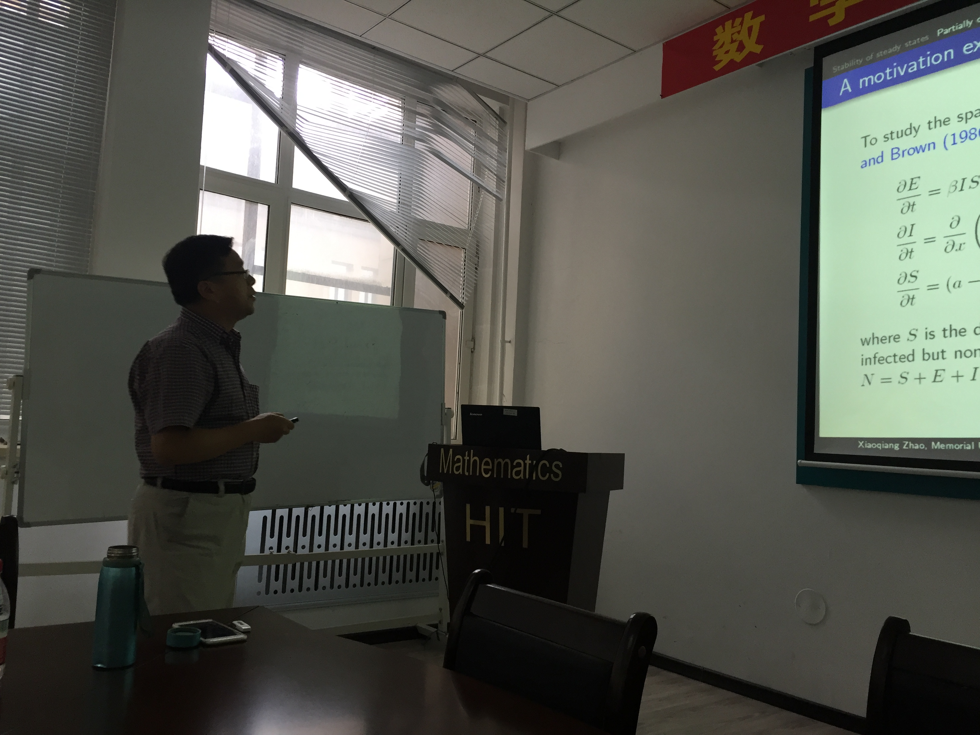 受国际合作处的资助,作为数学系SCI期刊编委校园行活动一部分,著名应用动力系统专家、加拿大纽芬兰纪念大学赵晓强教授应蒋卫华教授的邀请,于2017年7月1日至14日在yl8cc永利线路检测中心数学系做访问交流。 赵晓强教授以反应扩散方程和动力系统研究中的几个热点问题为主题,在7日、9日、11日下午14:00-17:00,分别从反应扩散方程解的存在唯一性、正不变性、有界性、单调性等基本性质,稳定性与主特征值,吸引子和持久性,基本再生数,抽象泛函微分方程解映射的紧性等方面做了六个精彩的学术报告。报告由蒋卫华教授主持,相关专业的四十余位师生有幸参与讲座和讨论,报告也吸引了包括哈尔滨工程大学、哈尔滨师范大学、黑龙江大学、哈尔滨理工大学和东北林业大学的多位师生慕名前来参加。赵老师的系列报告系统、全面、细致、深入,师生们从中收获颇丰。