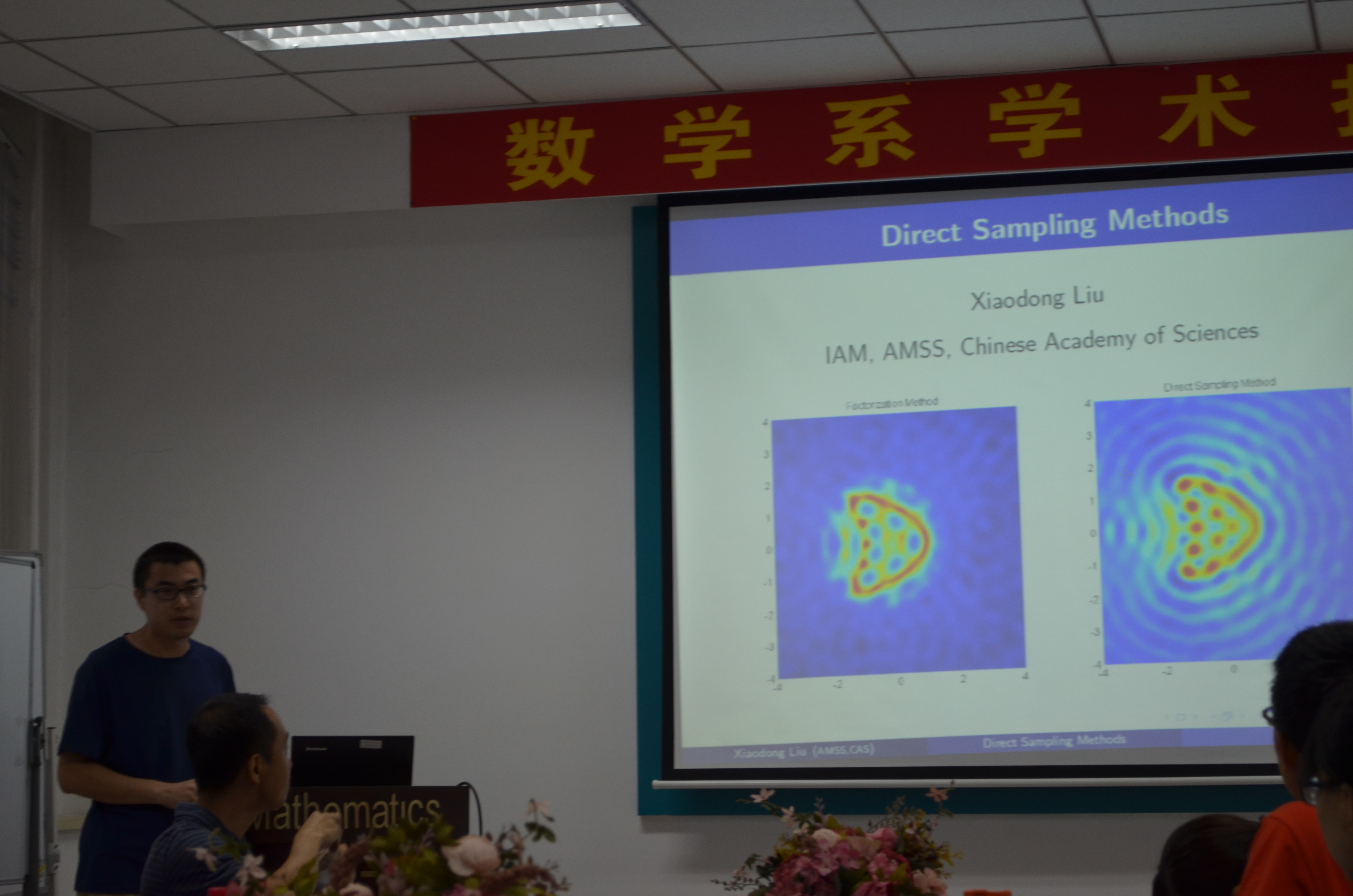 应数学系郭玉坤副教授的邀请,2017年7月10日至7月19日期间,中国科学院数学与系统科学研究院应用数学所刘晓东副研究员来公司访问,与数学系部分师生就反问题数值计算等问题进行了交流。7月17日上午8:30至9:15,刘晓东老师在格物楼503数学系报告厅做了一场《关于反问题计算中的直接采样算法》的学术报告。刘老师的报告系统深入地介绍了反散射理论的若干前沿热点问题及各种采样算法的基本思想。报告由郭玉坤副教授主持,相关专业的二十余位师生参加了讲座并进行了热烈讨论。