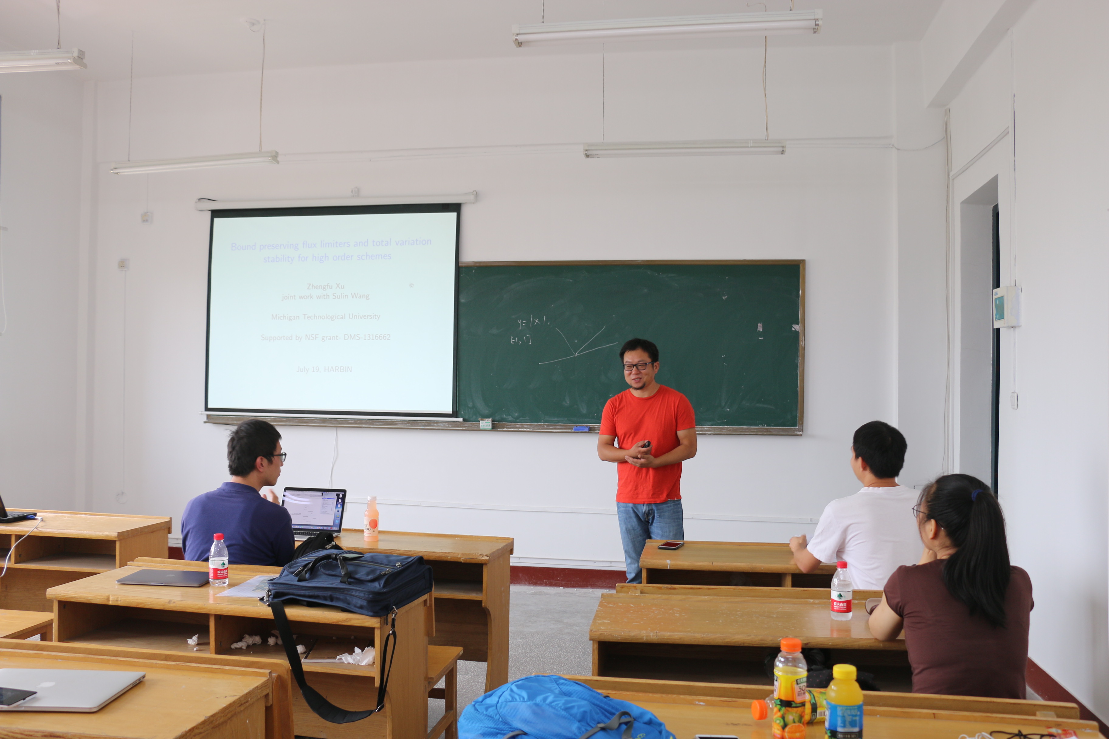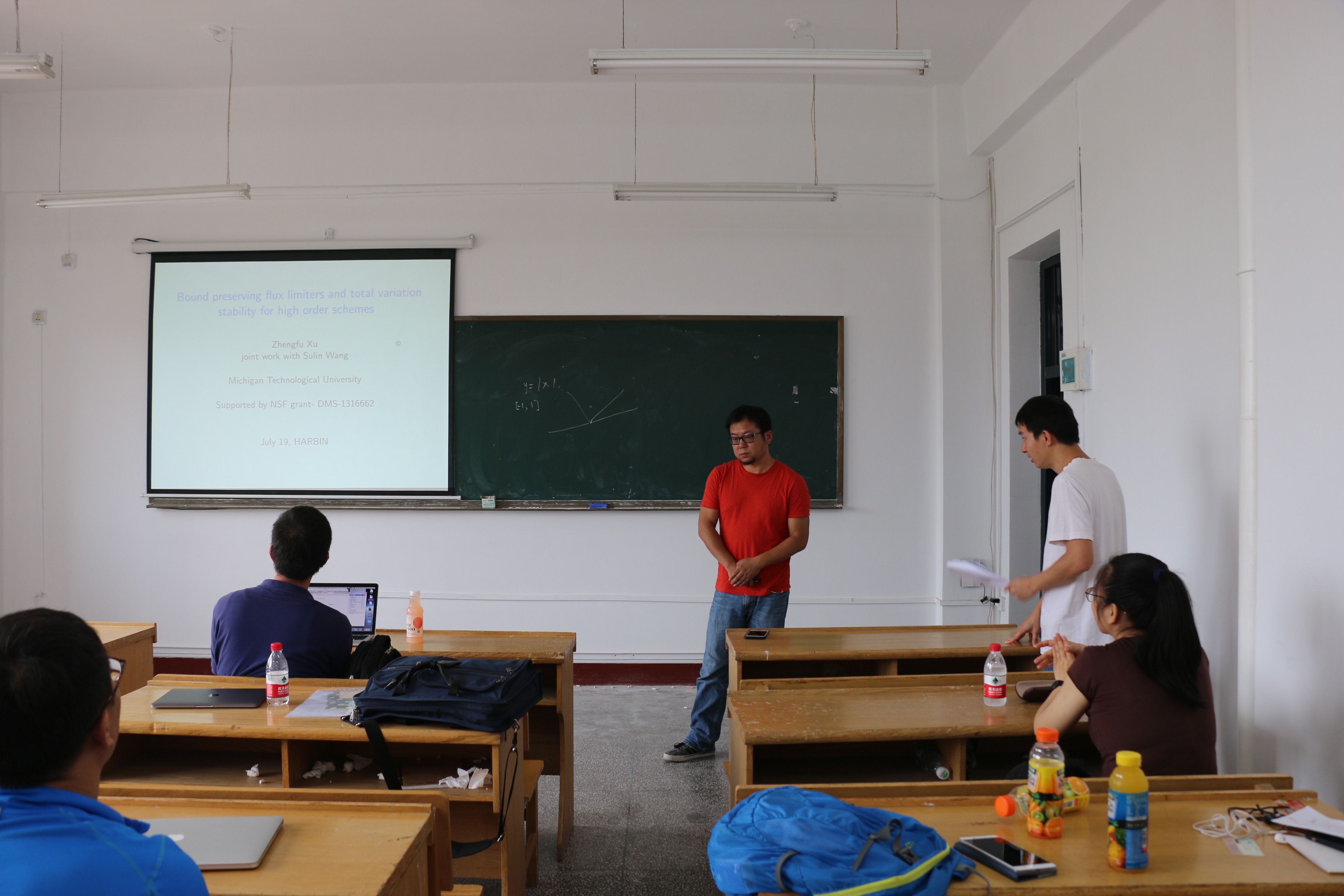 受国际合作处资助,应数学系吴勃英教授和数学系与数学研究院孟雄副教授邀请,美国密西根理工大学徐正富副教授近日访问了公司,并于2017年7月19日上午10:00-11:00在格物楼522会议室作了题为“High order total variation bounded finite difference method for one-dimensional conservation laws”的学术报告,报告由孟雄副教授主持,数学系20余位师生听取了报告并进行了热烈的讨论。报告主要介绍了求解双曲守恒律方程的高阶总变差有界的有限差分格式。