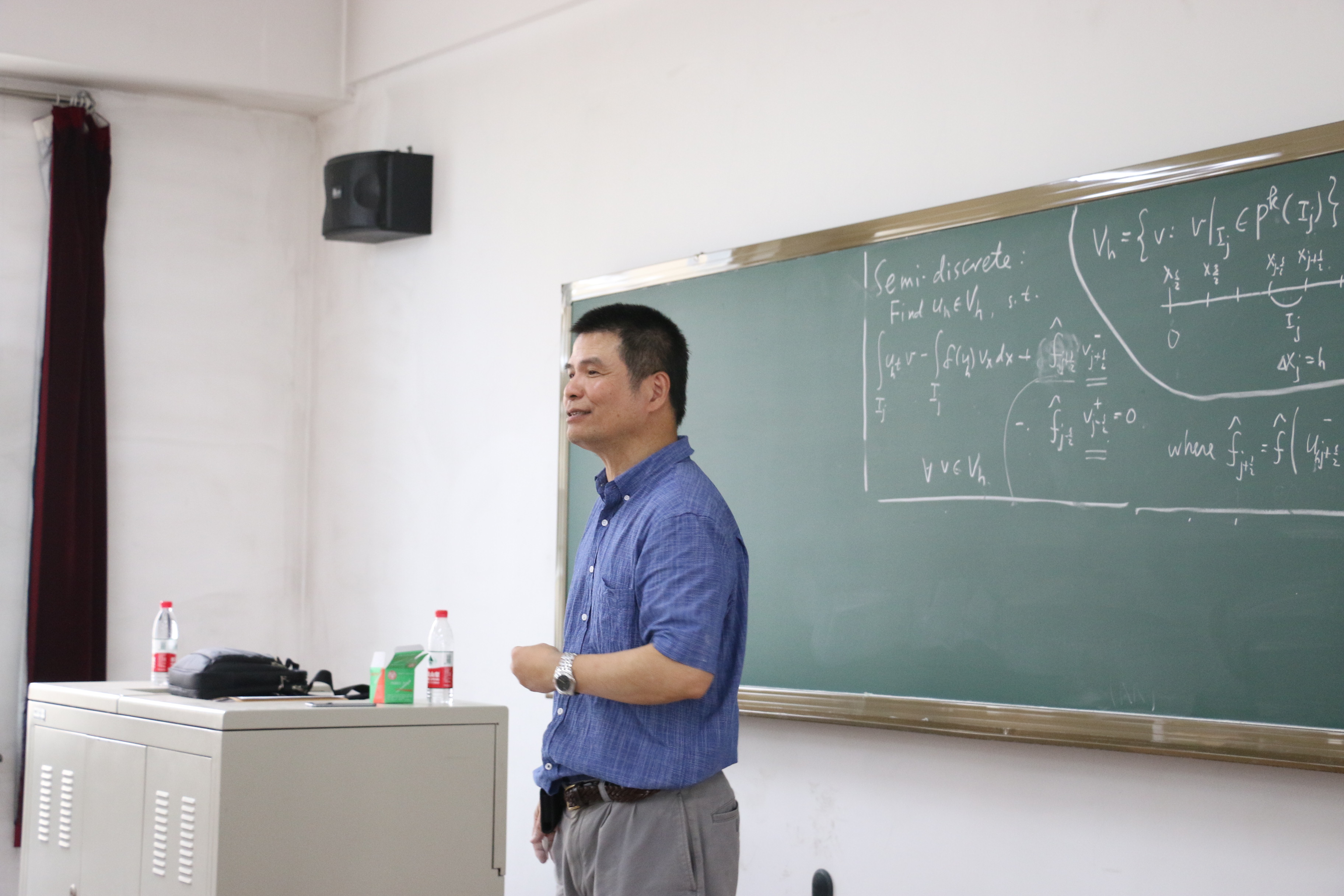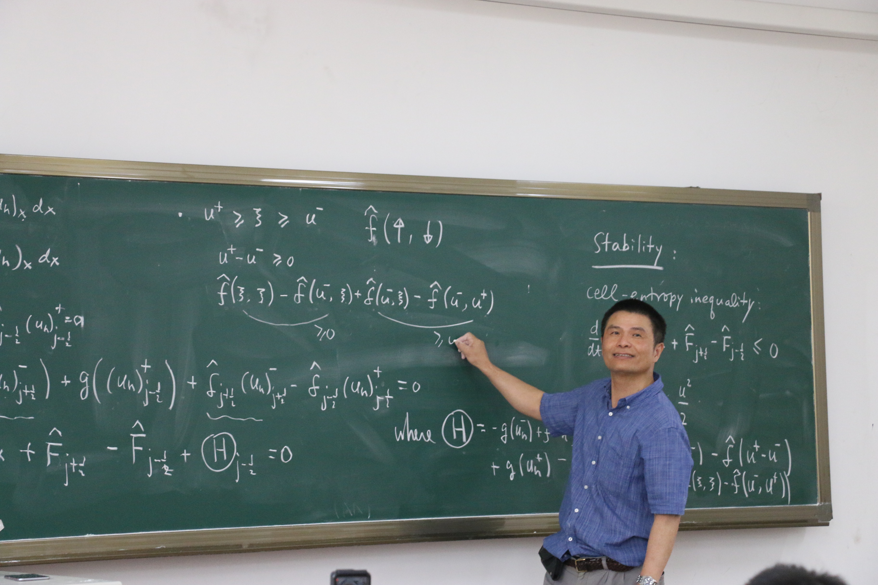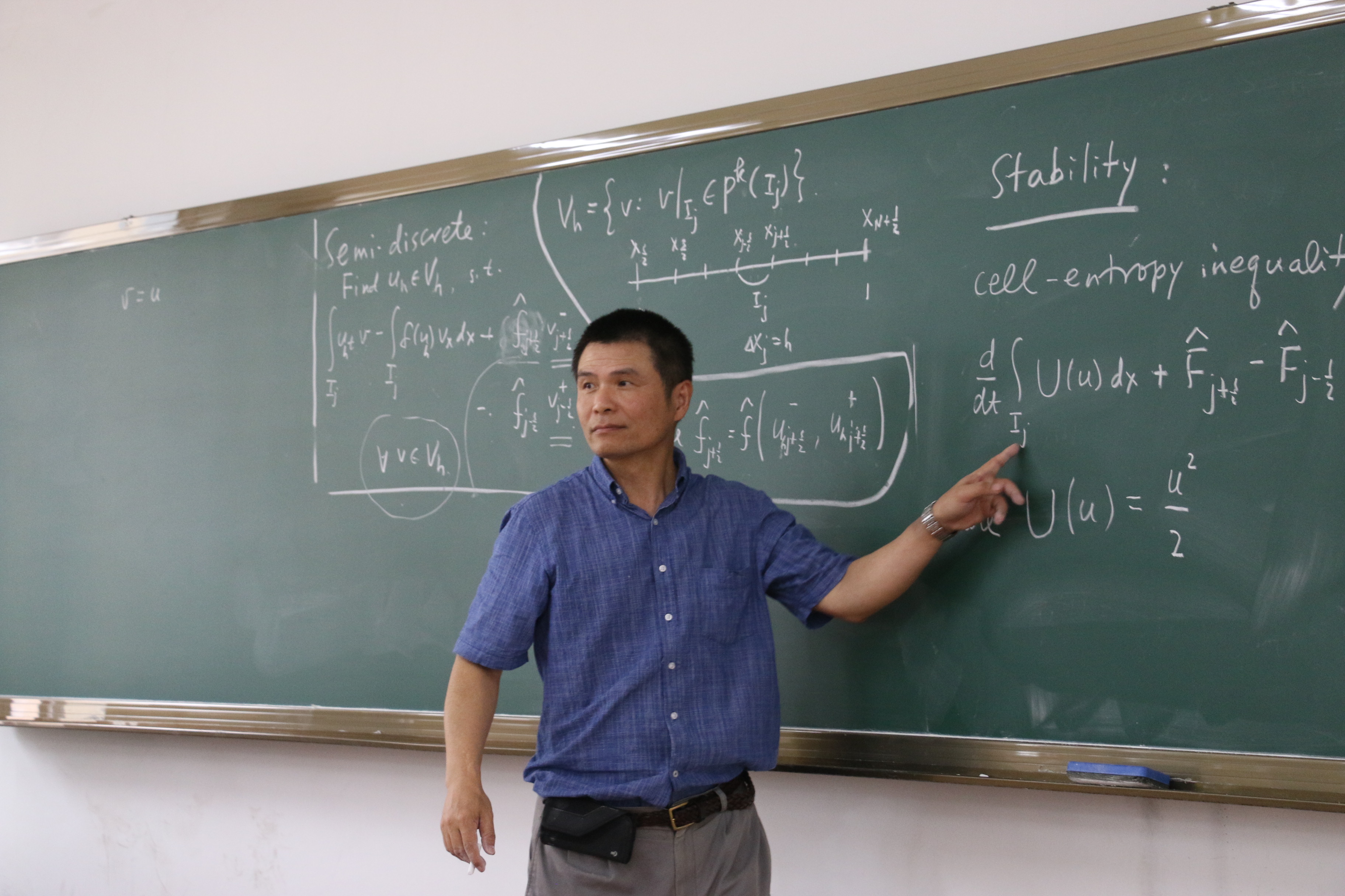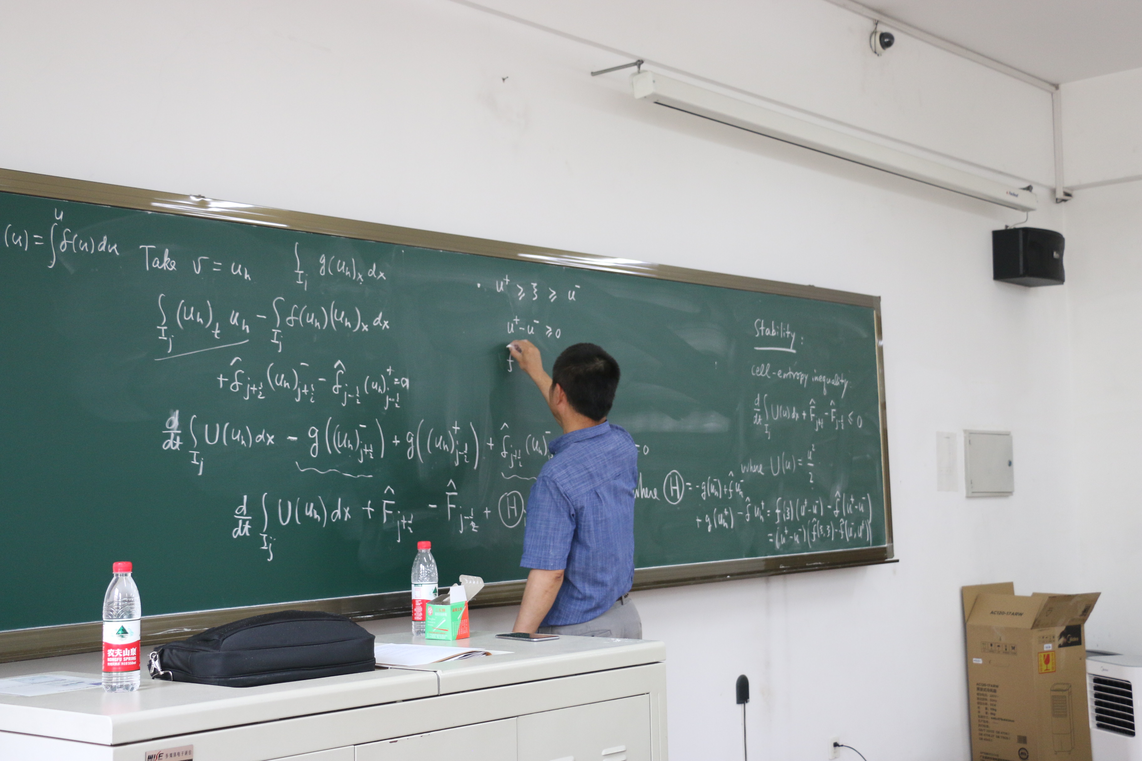 受yl8cc永利线路检测中心本科生院及国际合作处资助,应数学系邀请,美国布朗大学舒其望教授于2017年7月16日至22日访问了公司,并讲授了名为“Discontinuous Galerkin methods for convection-dominated problems”的短期前沿课程。本课程共16学时(7月17号、18号、20号和21号下午的5-8节),主要介绍了求解对流占优偏微分方程的间断有限元方法,重点讨论了间断有限元格式的数值流通量选取、单元熵不等式与L2稳定性、最优收敛性以及高阶偏微分方程局部间断有限元方法的构造与分析等;共吸引了yl8cc永利线路检测中心数学系及其它高校的师生共60余人前来聆听,并进行了热烈的讨论。通过本门课程的讲授,促进了同学们对高阶精度算法尤其是间断有限元方法的理解与掌握,培养了同学们解决实际工程科学计算问题的能力。