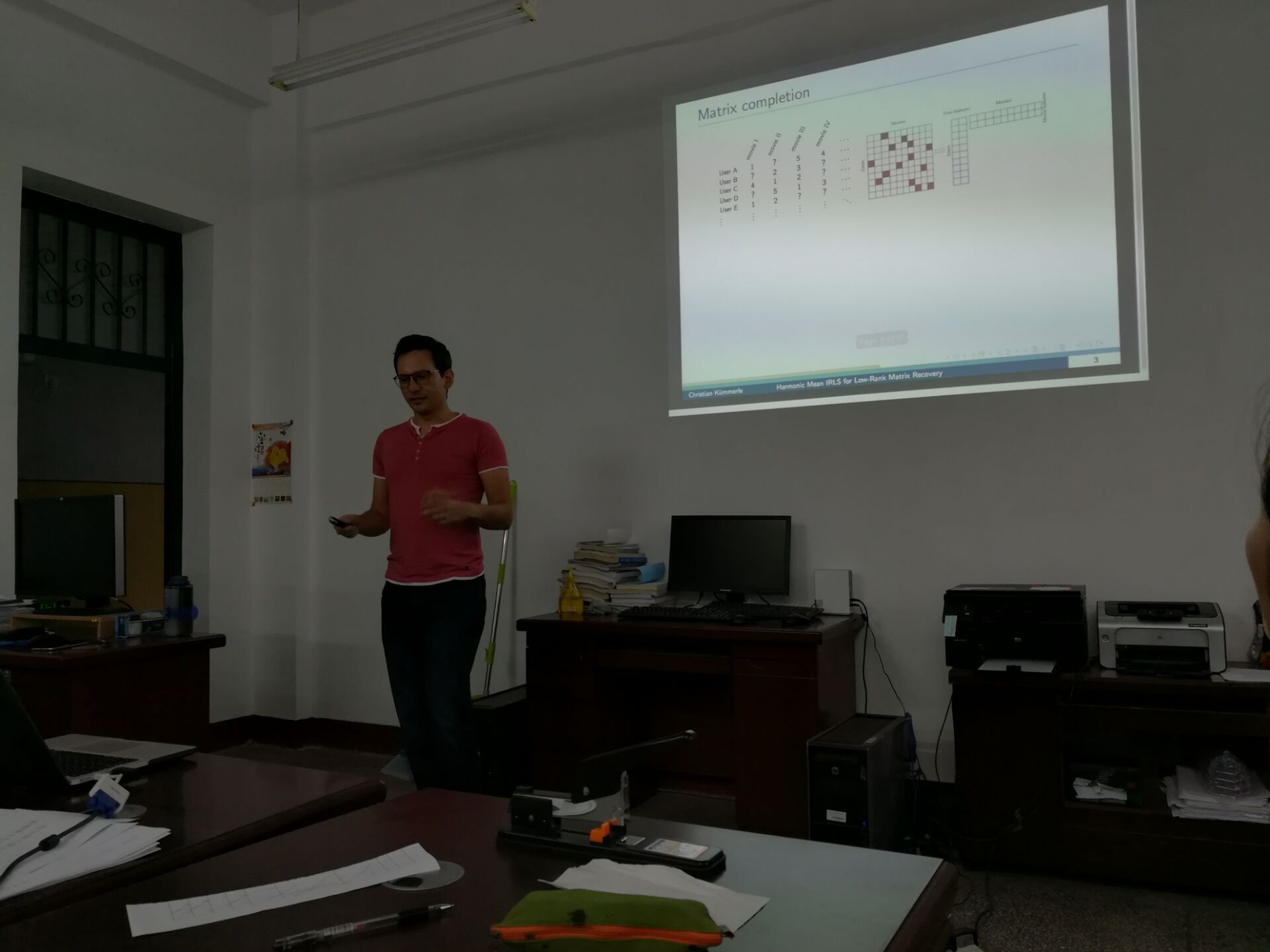 题目:Harmonic Mean Iteratively Reweighted Least Squares for Low-Rank Matrix Recovery 报告人:Christian Kümmerle 时间:2017年9月5日星期二,晚上18:00到20:00 地点:格物楼518 摘要:We propose a new iteratively reweighted least squares (IRLS) algorithm for the recovery of a matrix X in dimension (d_1 x d_2) of rank r from incomplete linear observations, solving a sequence of low complexity linear problems. The easily implementable algorithm, which we call harmonic mean iteratively reweighted least squares (HM-IRLS), optimizes a non-convex Schatten-pp quasi-norm penalization to promote low-rankness and carries three major strengths, in particular for the matrix completion setting. First, the algorithm converges globally to the low-rank matrix for relevant, interesting cases, for which any other (non-)convex state-of-the-art optimization approach fails the recovery. Secondly, HM-IRLS exhibits an empirical recovery probability close to 1 even for a number of measurements very close to the theoretical lower bound r(d1+d2−r),i.e., already for significantly fewer linear observations than any other tractable approach in the literature. Thirdly, HM-IRLS exhibits a locally superlinear rate of convergence (of order 2−p) if the linear observations fulfill a suitable null space property. While for the first two properties we have so far only strong empirical evidence, we prove the third property as our main theoretical result.Joint work with Juliane Sigl (Technische Universität München, Germany). 个人简介:Christian Kümmerle是德国慕尼黑工业大学博士,曾在法国巴黎第六大学和美国弗吉尼亚大学交流。他的研究兴趣方向是统计、最优化、高维概率理论的交叉研究和它们在数据相关问题中的应用。