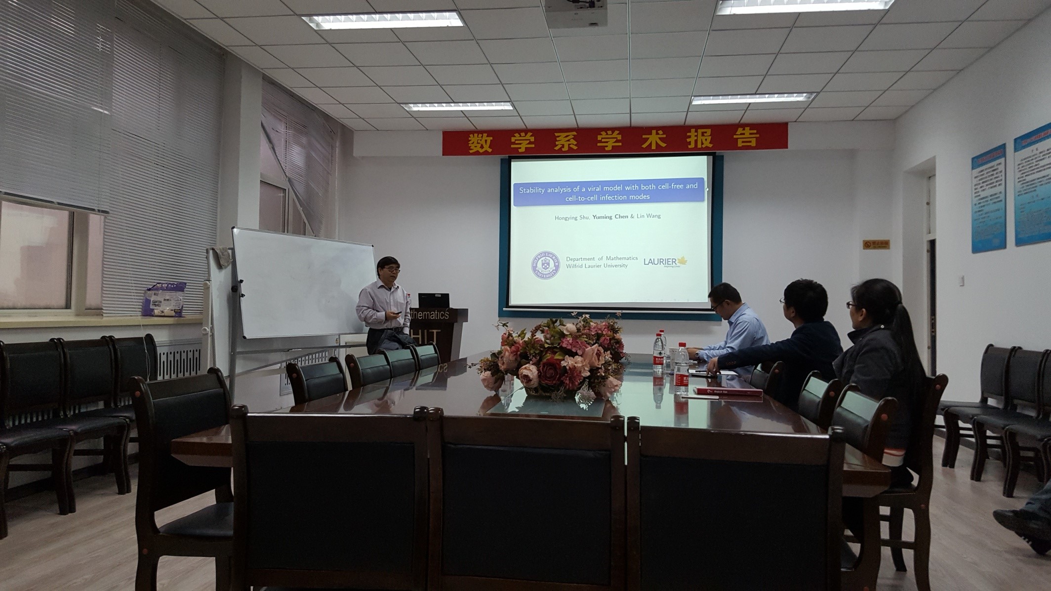 受学校国际合作与交流基金资助,应数学系刘胜强教授邀请,加拿大劳里埃大学陈玉明教授于2017年10月10—19日来公司进行了成功的学术访问。并分别于10月11日下午13:00—8:00以及12日 上午8:00—12:00在格物楼503会议室做了八个精彩的动力系统理论及其应用系列学术报告。报告由刘胜强教授主持,数学系及哈市其他高校20余位师生听取了报告并进行了热烈的讨论。