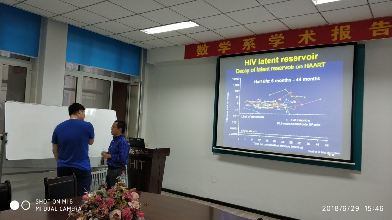 第三场报告时间为6月29日下午15:30-17:00,地点为格物楼503室,报告题为“New multi-stage and multi-scale models in HIV dynamics”,荣礼彬教授的这个报告围绕药物代谢学、药物动力学与HIV病毒载量间的复杂动力学联系的研究等方面做了介绍。以上这些内容均涉及到目前公共卫生研究领域中病毒动力学建模与分析方向的前沿研究分支。