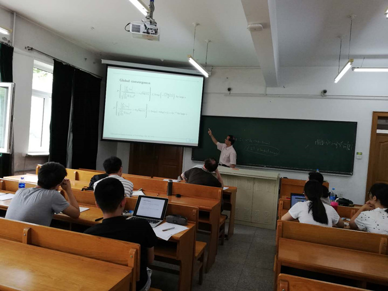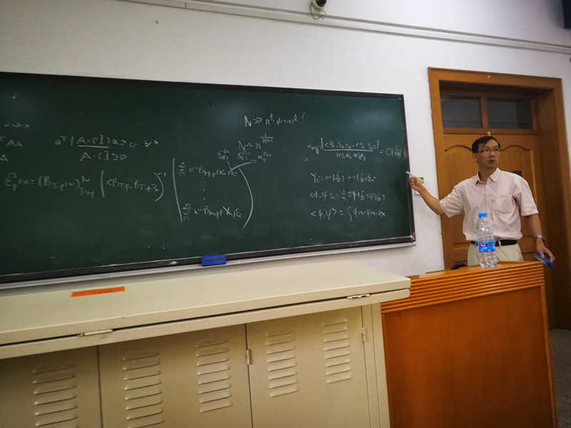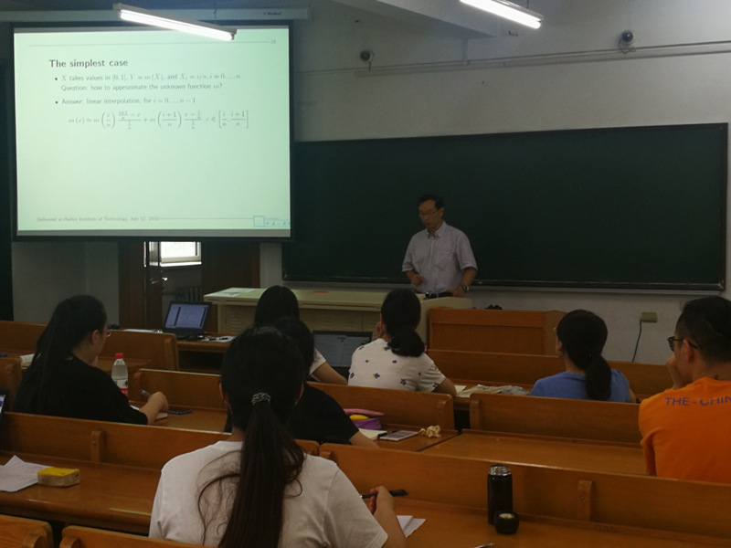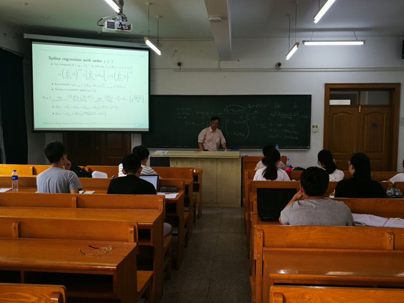 第一场专题报告:时间为7月12日上午8:00-12:00,地点为诚意楼215室,总共4节课。杨立坚教授以“Polynomial Spline Regression1”为题系统地讲述多项式样条回归的Motivation and tools,The Simple and General cases,Assumptions,Basics on B spline,Spline Estimation,Bernstein's inequality等方面的知识和问题。