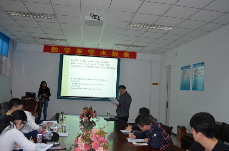 第一场报告时间为9月17日下午14:00-17:00,地点为格物楼503室,总共两个报告。赵教授分别以“Bivariate Probit Model, Partial Identification and Treatment Effect of Health Insurance on Dental Visits”、“Health status and labour market outcome: empirical evidence from Australia”为题系统地介绍了经济计量中的双变量Probit模型,其在医疗卫生及经济政策效应分析中有广泛的应用。