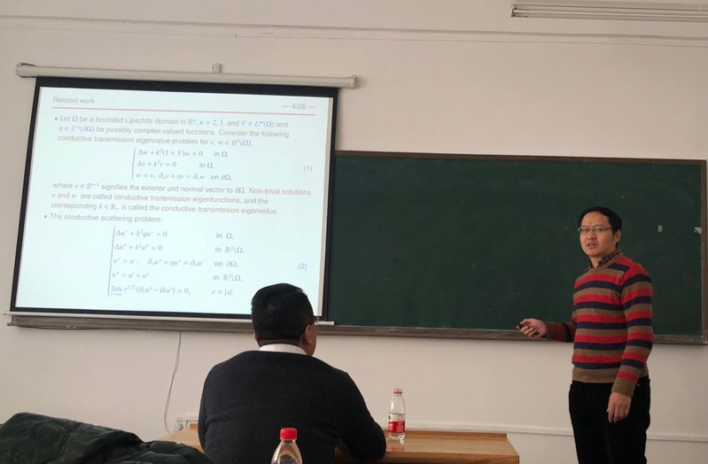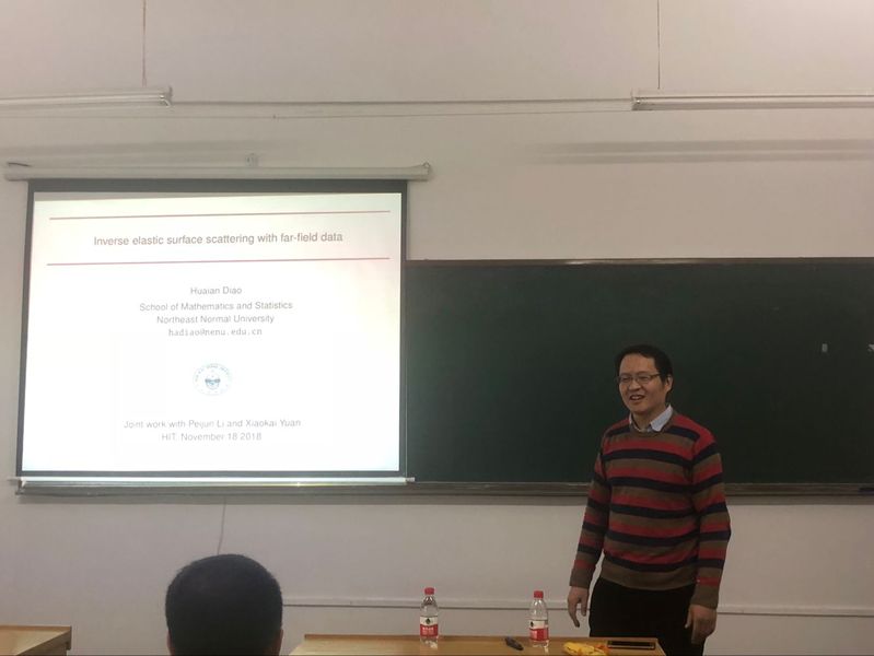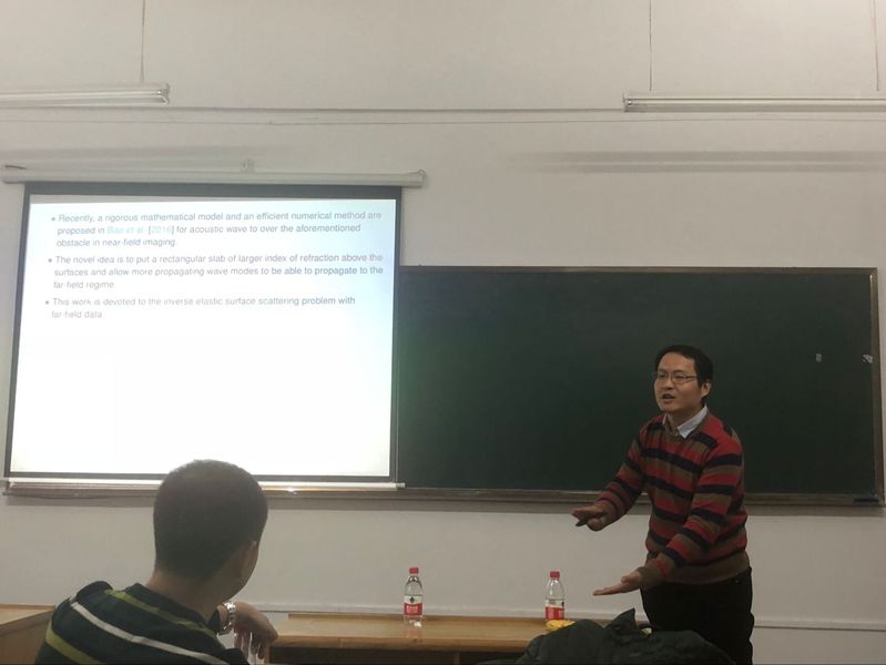应数学系郭玉坤副教授的邀请,东北师范大学数学与统计学院刁怀安副教授于2018年11月18至20日到公司进行了学术访问。刁怀安老师分别于18日下午15:00-16:00和20日上午10:00-11:00在格物楼522报告厅做了两场学术讲座,报告内容涉及弹性波反散射、传输特征函数的几何应用等。报告由郭玉坤副教授主持,数学系相关方向的师生参加了报告会并与刁怀安老师进行了热烈的学术交流与讨论。