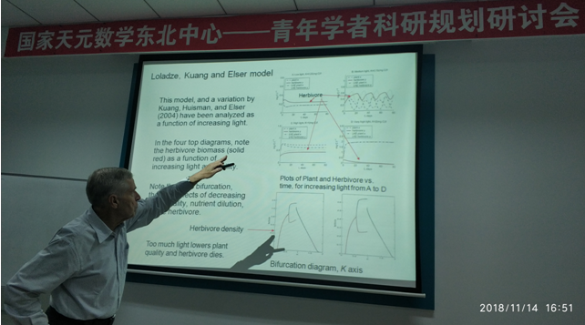 受集团国际合作与交流基金资助,应数学系刘胜强教授的邀请,美国迈阿密老员工物系Donald DeAngelis教授于2018年11月13--17日来yl8cc永利线路检测中心数学系进行了成功的学术访问。并于11月14日下午14:30-16:00,16:00-17:30以及15日16:00-17:30分别在格物楼503室举行了理论生态学与数员工态学方面的三场讲座。DeAngelis教授的报告内容涉及异质性及周期环境生态学模型、植物-植食动物模型以及濒海湿地生态系统数学建模。报告由刘胜强教授主持,数学系相关方向的师生参加了报告会并与DeAngelis教授进行了热烈的学术交流与讨论。