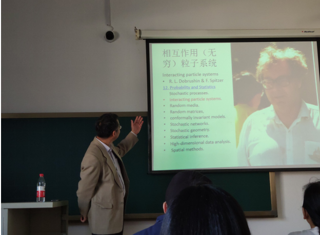 第一场报告时间为3月29日下午14:00-15:00,地点为正心楼308室。陈教授以“相互作用(无穷)粒子系统与随机游走”为题系统地介绍了相互作用粒子模型,作为概率与统计中一个极其重要的研究领域,无穷粒子系统是一类重要的马氏过程,具有广泛的应用背景。由于相互作用的原因,模型比较复杂,状态空间通常是无穷维的,研究手段很有限。陈教授从其导师T.M. Liggett的专著《Interacting particle systems》出发,介绍无穷粒子系统的背景,研究方法及发展现状,以选举模型,排他过程和接触过程为例,围绕存在性及极限性质将其转化为马氏链随机游走的相遇问题,通过与简单随机游动的比较给出了模型的一些性质。