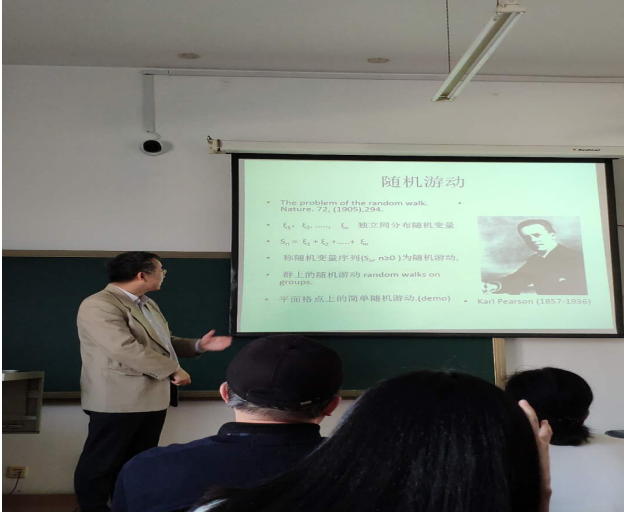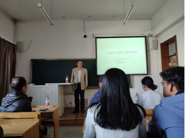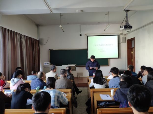 第二场报告时间为3月29日下午15:10-16:10,地点为正心楼308室。陈教授以“规则树上排他过程标识粒子的极限定理”为题,从第一个报告中介绍的两个最常见的无穷粒子系统模型:选举模型和排他过程出发,给出了该模型的中心极限定理,并探索了新问题“随机游动会不会到达某个点或某个区域?”,以及向听众分享了随机过程中一些尚未解决的公开问题。