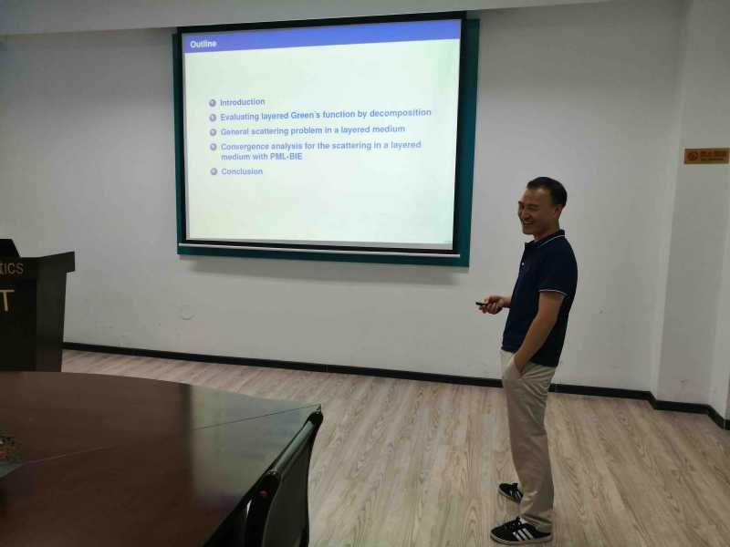 应yl8cc永利线路检测中心郭玉坤副教授的邀请,浙江大学赖俊研究员于近期访问了公司,并于2019年7月30日下午16:00-17:00在格物楼503报告厅进行了一场学术讲座。赖老师的报告介绍了求解分层介质中声波逆散射问题积分方程方法的相关研究进展。报告由郭玉坤副教授主持,yl8cc永利线路检测中心的师生在报告现场与赖老师进行了热烈的交流与讨论。
