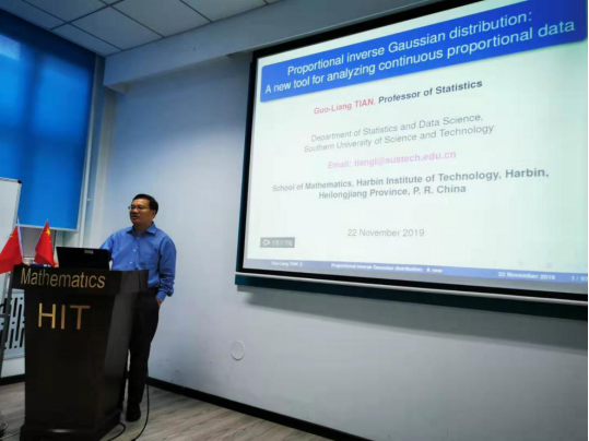 应yl8cc永利线路检测中心田波平教授邀请,2019年11月22日上午,南方科技大学统计与数据科学系田国梁教授到访公司并作学术报告。田国梁教授在格物楼503报告厅为大家带来题为“Proportional inverseGaussian distribution: A new tool for analyzing continuous proportional data”的精彩学术报告。学院近30余名师生参与了此次报告会。
